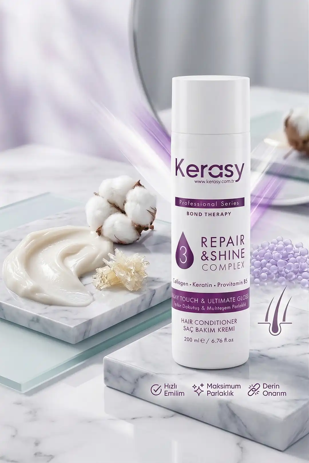 "Bu kremi sıradan kremlerle karıştırmayın. Kerasy Bond Therapy, adeta bir 'nem hapsetme' uzmanıdır. İçeriğindeki Hidrolize Keratin ve Kolajen, saç tellerindeki çatlakları doldururken; Panthenol nemi içine mühürler. Duşta parmaklarınızın saçınızdan akıp gitmesi ve kuruduğunda gelen o ipeksi dokunuş... Gerçek bir profesyonel salon bakımı etkisi!"